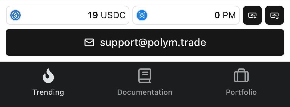 On the bottom bar tap your email address (e.g. support@polym.trade) — this opens your profile and wallet settings.