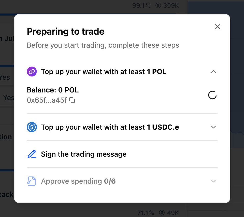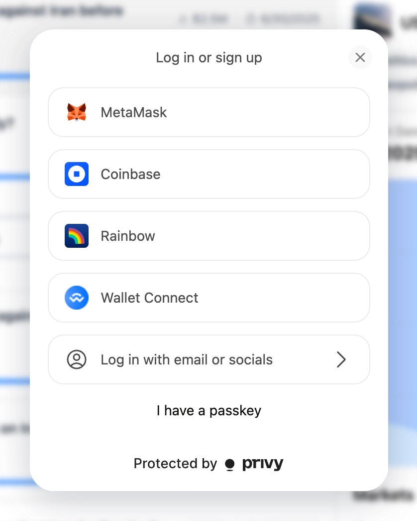 Go to polym.trade, click “Log in” and connect your wallet — or create a new one using email